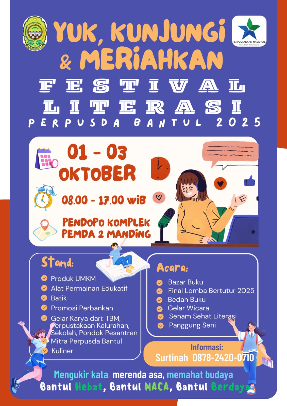 Kunjungi dan Meriahkan Festival Literasi Perpusda Bantul 2025, pada tanggal 01 - 03 Oktober 2025, pukul 08.00 WIB - 17.00 WIB, di Pendopo Komplek Pemda 2 Manding.