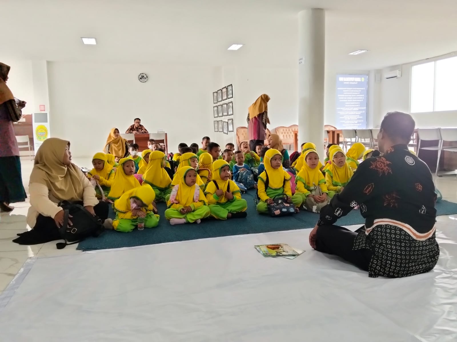 Mereka di ajak berkeliling mengenal perpusda dan berhenti di lantai 3 untuk mendengarkan dongeng,bernyanyi dan menari serta menonton film islami.Setelah selesai mereka dengan gembira bermain di Playground.