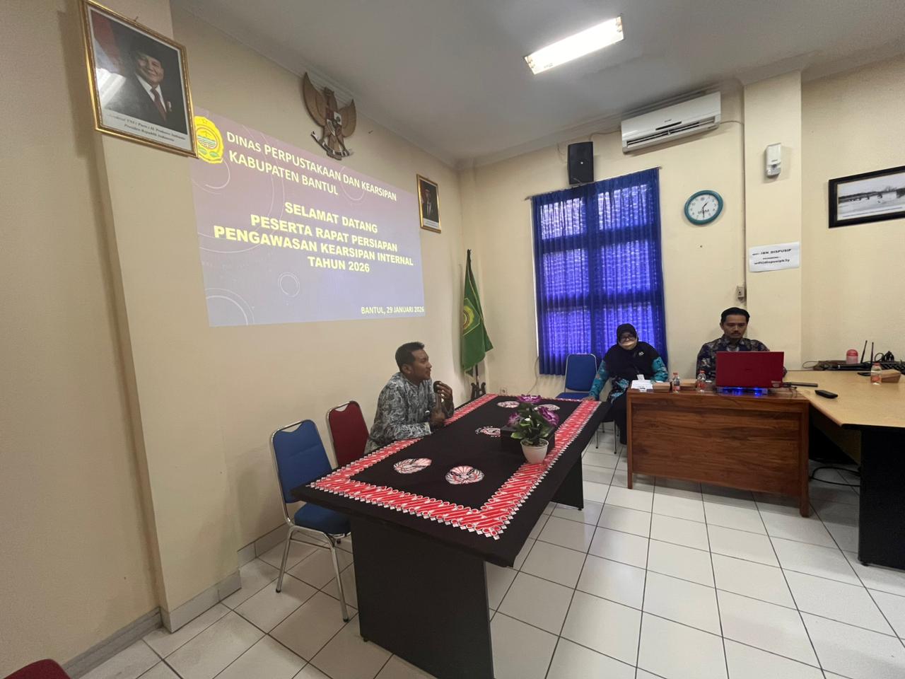 Bidang Kearsipan Dinas Perpustakaan dan Kearsipan Kabupaten Bantul mengadakan Rapat Persiapan Pengawasan Kearsipan Internal Tahun 2026. Rapat ini mengundang 53 perangkat daerah se Kabupaten Bantul untuk mempelajari instrumen pengawasan kearsipan terbaru. Diselenggarakan di Ruang Rapat Bidang Kearsipan, rapat ini dibagi menjadi tiga hari dengan narasumber arsiparis Bidang Kearsipan. Dilaksanakan pada tanggal 28-30 Januari 2026, tujuan dilaksanakan rapat ini agar perangkat daerah dapat mempersiapkan bukti dukung lebih maksimal. Rencananya desk pengawasan kearsipan internal akan dilaksanakan di bulan April 2026.